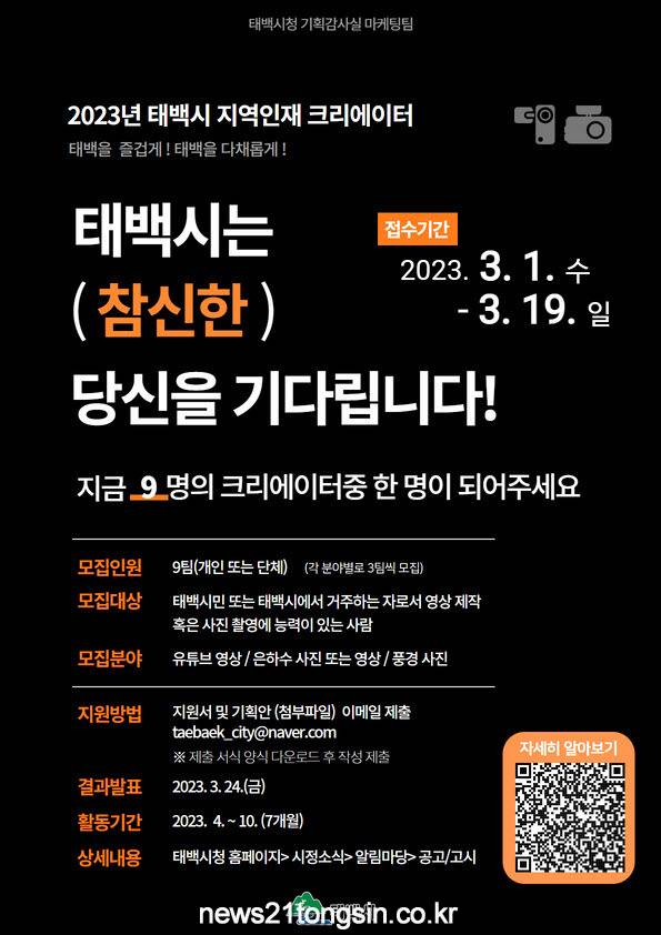 태백시(시장 이상호)는 오는 19일까지 다양한 재능을 가진 ‘2023년 태백시 지역인재 크리에이터’를 모집한다고 밝혔다.