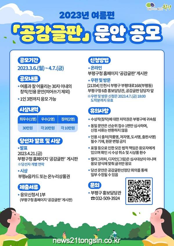 부평구(구청장 차준택)가 오는 6일부터 다음달 7일까지 한 달간 ‘2023년 여름편 공감글판’ 문안을 공모한다.
