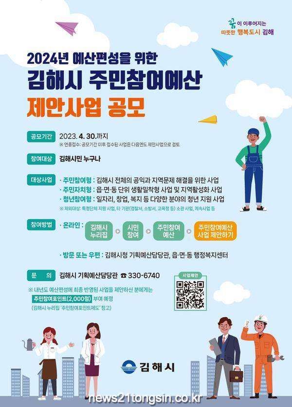 김해시(시장 홍태용)는 4월 30일까지 2024년도 예산에 반영할‘주민참여예산 제안사업’을 집중 공모한다고 밝혔다.