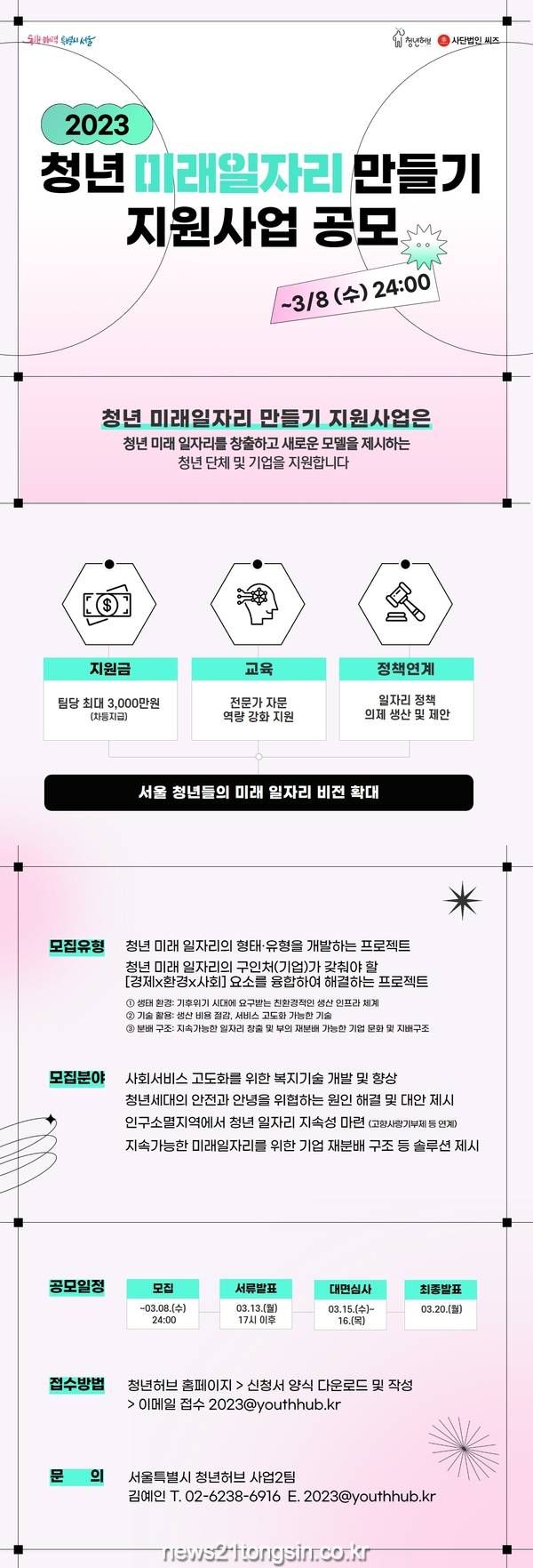 서울시 청년허브는 ‘2023 청년 미래일자리 만들기 지원사업’을 통해 청년 미래일자리 개발에 나설 기업과 단체를 이달 8일까지 모집한다고 밝혔다.