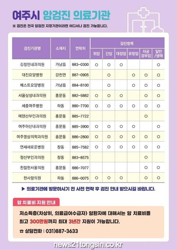 여주시보건소(소장 최영성)는 우리나라 사망원인 1위인 암의 조기발견 및 조기치료를 위해 국가 암 검진 대상자에게 ‘국가암검진’ 홍보에 나섰다고 밝혔다.