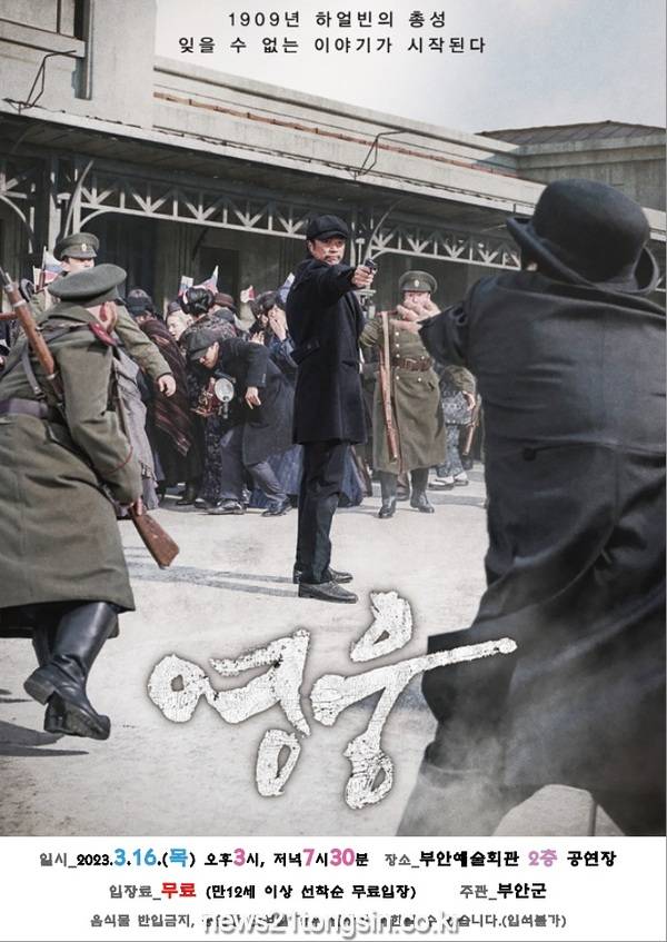 부안군은 영화<</span>영웅>을 오는 3월 16일(목) 오후 3시와 오후 7시 30분에 부안예술회관 공연장에서 하루 2회에 걸쳐 무료로 상영한다.