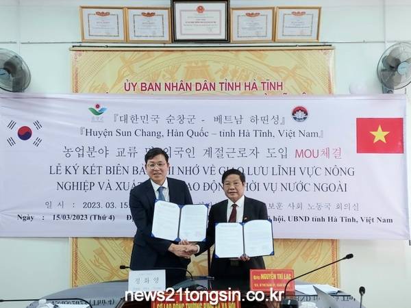 군은 15일 최영일 순창군수를 대신해 정화영 부군수가 베트남 현지를 방문하여 하틴성 레띠 사우 부성장 등 양국 기관 관계자들이 참석한 가운데 외국인 계절근로자 파견 업무협약을 체결하고 두 기관 간 상생발전과 상호 협력을 약속했다고 밝혔다.