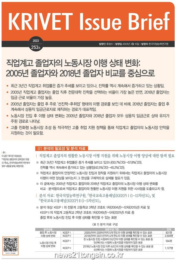 한국직업능력연구원(원장 류장수)은 3월 15일(수) ‘KRIVET Issue Brief 253호(직업계고 졸업자의 노동시장 이행 상태 변화: 2005년 졸업자와 2018년 졸업자 비교를 중심으로)’를 통해 직업계고 졸업자의 노동시장 이행 상태 변화를 분석했다.