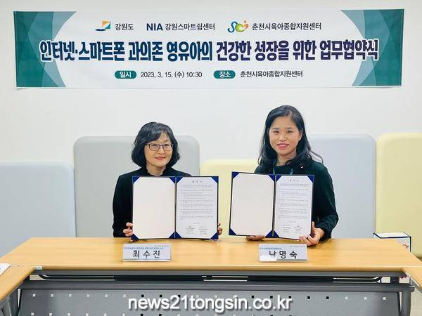 강원스마트쉼센터는 3월 15일(수) 11시, 춘천시육아종합지원센터와 인터넷․스마트폰 과의존 영유아의 건강한 성장을 지원하기 위해 업무협약을 체결했다.