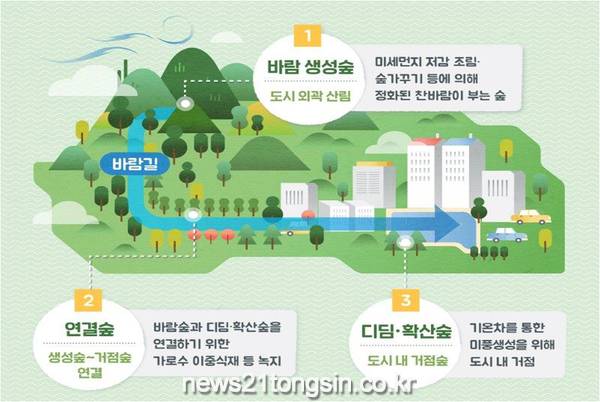 도시바람길숲의 원리는 밤낮의 기압차를 이용해 도시 외곽에서 조성한 숲이 생성하는 맑고 찬 공기를 연결숲을 만들어 도시 내부로 끌어 들이고, 도심에는 특성에 맞는 다양한 숲으로 녹화하여 대기 순환을 통해 미세먼지 등 오염물질과 뜨거운 공기를 외부로 배출하는 기능의 생태 시스템이다.