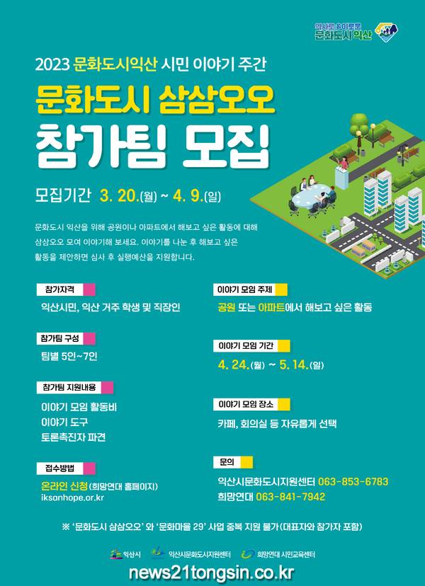 익산시문화도시지원센터는 ‘2023 문화도시 삼삼오오’에 함께할 참가자를 20일부터 다음달 9일까지 모집한다.