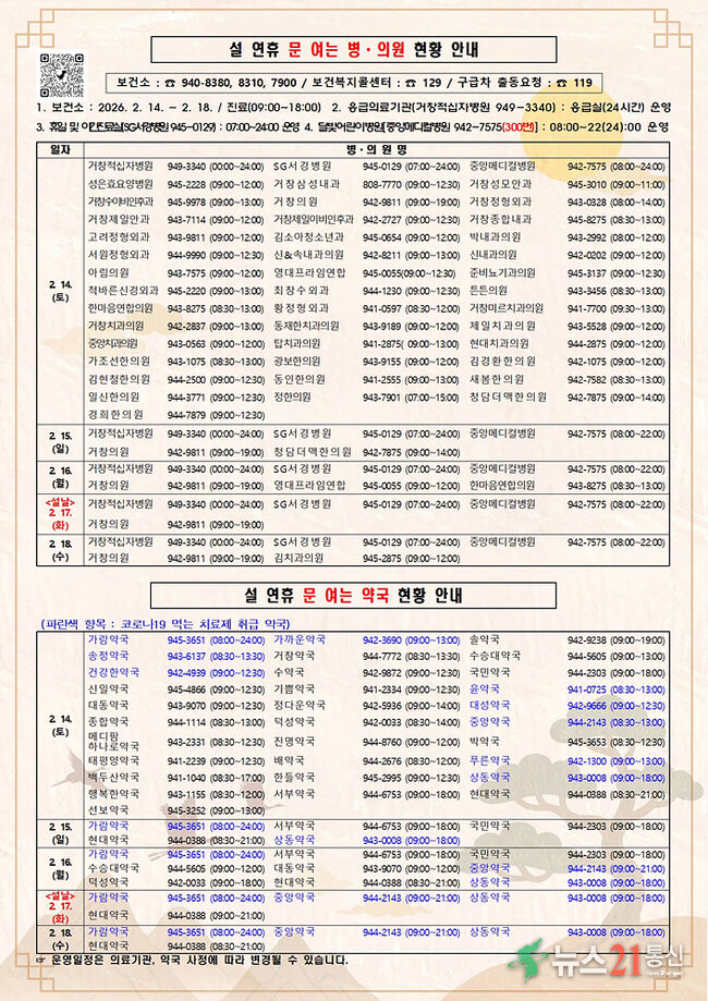 [뉴스21 통신=김희백 ] 거창군은 귀성객과 군민이 건강하고 안전한 설 연휴를 보낼 수 있도록 오는 14일부터 18일까지 설 연휴 기간 응급진료체계를 강화해 운영한다고 5일 밝혔다. 설 연휴 기간 귀성객과 군민의 의료 이용 불편을 최소화하기 위해 응급의료기관의 24시간 응급실 운영, 야간진료실 및 달빛어린이병원 운영과 문 여는 병·의...