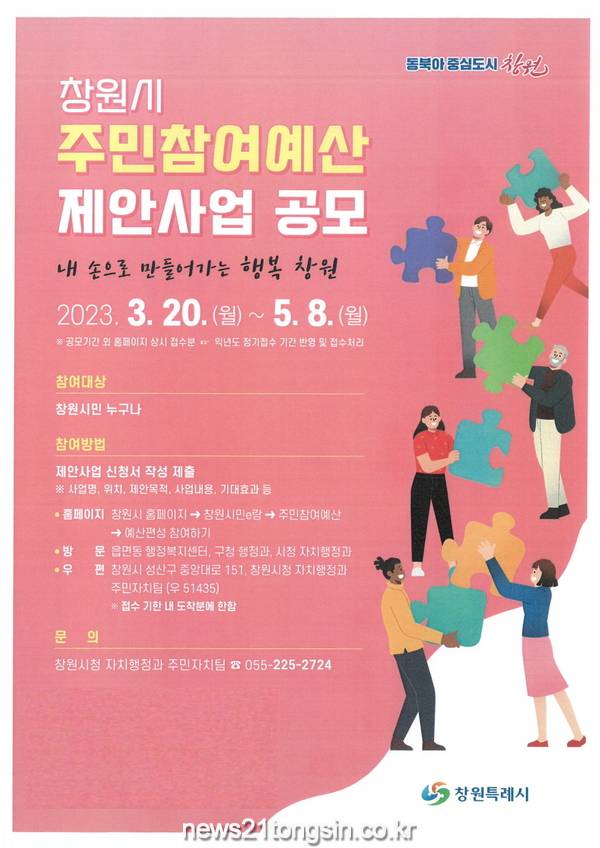 창원특례시(시장 홍남표)는 20일부터 5월 8일까지 창원시 주민참여예산 제안사업 공모를 시행한다고 밝혔다.