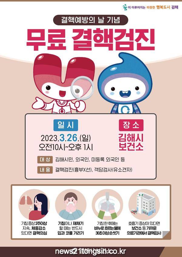 김해시보건소는 세계결핵예방의 날(3.24)을 맞아 오는 26일 오전 10시부터 오후 1시까지 시민과 외국인, 특히 의료 사각지대에 놓인 미등록 외국인을 대상으로 휴일 무료 결핵검진을 실시한다고 20일 밝혔다.