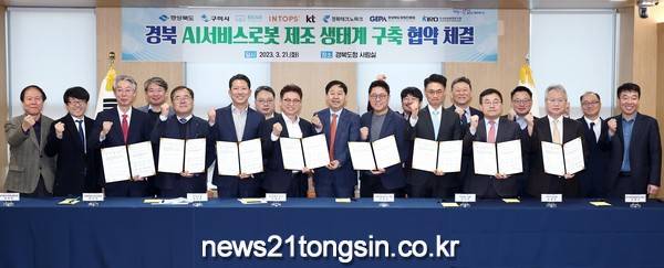 경북도는 21일 도청 사림실에서 AI서비스로봇 제조 글로벌 생태계 조성을 위해 경상북도, 구미시, 베어로보틱스, 인탑스, KT, 경북테크노파크, 경상북도경제진흥원, 한국로봇융합연구원 8자간의 업무협약(MOU)을 체결했다.