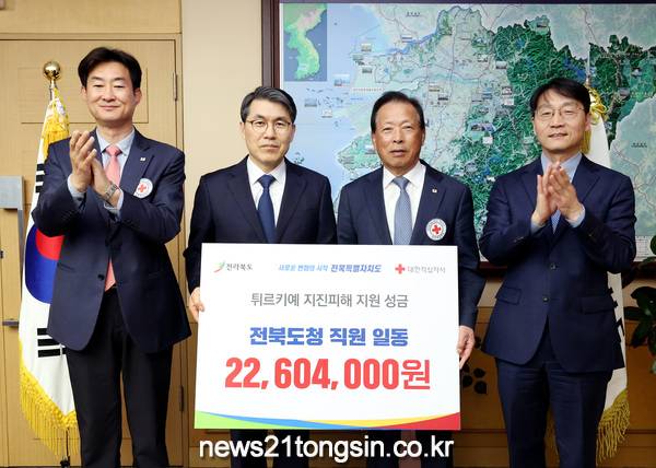 전북도는 21일 조봉업 행정부지사와 대한적십자사 이선홍 전북지사회장이 참석한 가운데 튀르키예·시리아 지진피해 지원성금 기탁식을 진행했다.