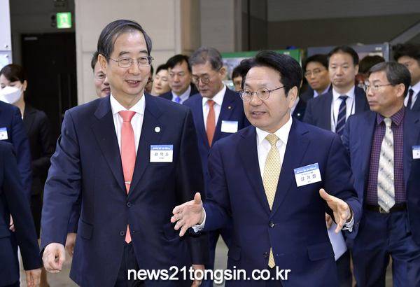 ‘2023년 세계 물의 날’ 기념식에 참석한 한덕수 국무총리와 강기정 광주광역시장이 22일 국제물산업박람회 참관을 위해 이동하고 있다.