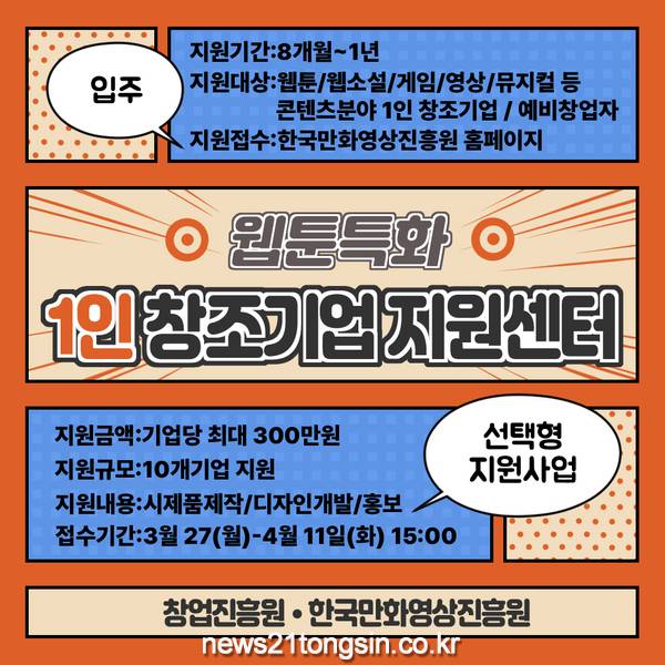 한국만화영상진흥원(원장 신종철)이 웹툰, 웹소설 등 콘텐츠 분야 산업의 1인기업 창업을 위해 <</span>웹툰특화 1인 창조기업 지원센터>를 운영한다.