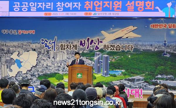 (뉴스21통신) 박창남기자 = 대구 달서구(구청장 이태훈)는 21일 구청 2층 대강당에서 2023년 1단계 대구형 희망플러스 일자리사업(공공근로사업) 참여자 300명을 대상으로「취업지원 설명회」를 개최했다고 밝혔다.