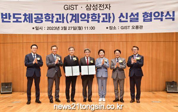 광주광역시(시장 강기정)는 27일 광주과학기술원 오룡관에서 강기정 시장, 이형석‧양향자 국회의원, 송재혁‧박승희 삼성전자 사장, 박래길 광주과학기술원 총장직무대행 등이 참석한 가운데 ‘광주과학기술원-삼성전자 반도체공학과(계약학과) 신설 협약’을 체결했다고 밝혔다.