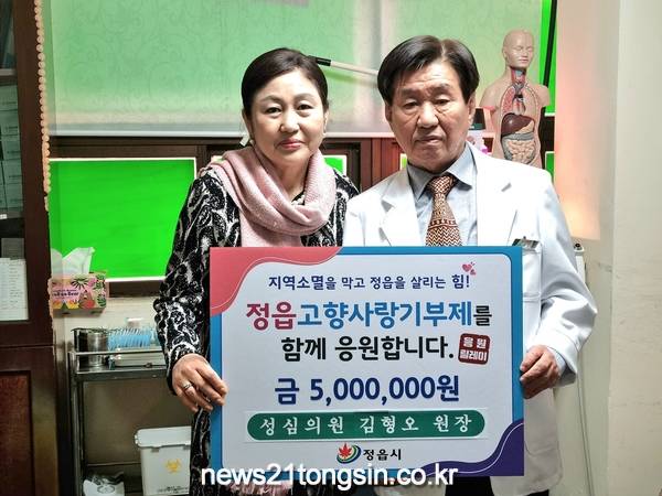 뉴스21통신전북/김문기기자=경남 하동군에서 성심의원을 운영하는 김형오 원장이 고향인 정읍의 발전을 위해 고향사랑기부제 개인 연간 최대 한도액인 500만원을 쾌척했다.