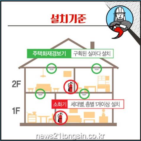 주택용 소방시설은 단독·다가구·다세대 주택에 의무적으로 설치해야하며, 소화기는 각 세대·층별 1개 이상, 화재감지기는 방과 거실 등 구획된 실마다 1개씩 설치해야한다.