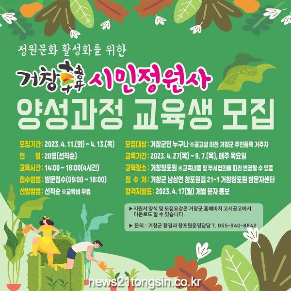 거창한 시민정원사 양성교육은 4월 27일부터 9월 7일까지 20주간 매주 목요일 거창창포원에서 무료로 진행하며, 전체 강의 일수 중 80% 이상 수강 시 수료증을 부여한다.