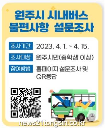 원주시는「원주시 시내버스 불편 사항 및 개선요청 사항」에 대한 설문조사를 오는 15일까지 실시한다고 밝혔다.