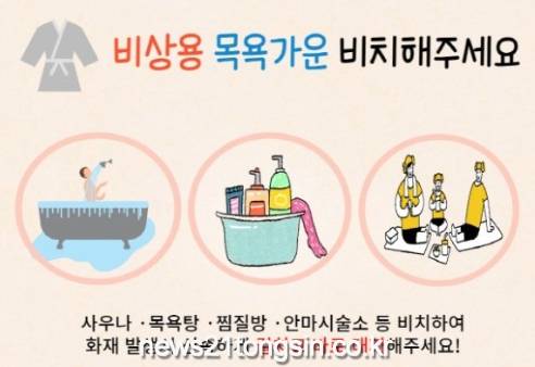 ‘비상 탈출용 가운’은 사우나, 목욕탕, 찜질방 등에 화재가 발생했을 때 옷을 챙기다 대피 시간이 늦어져 연기에 질식하는 등의 인명피해가 발생하는 일을 방지하기 위해 비치하는 가운이다.