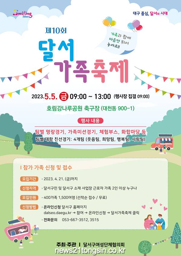 (뉴스21통신) 박창남기자 = 대구 달서구는 4월 21일까지 5월 어린이날 및 가정의 달을 맞아 제10회 달서가족축제 참가 가족을 모집한다고 밝혔다.