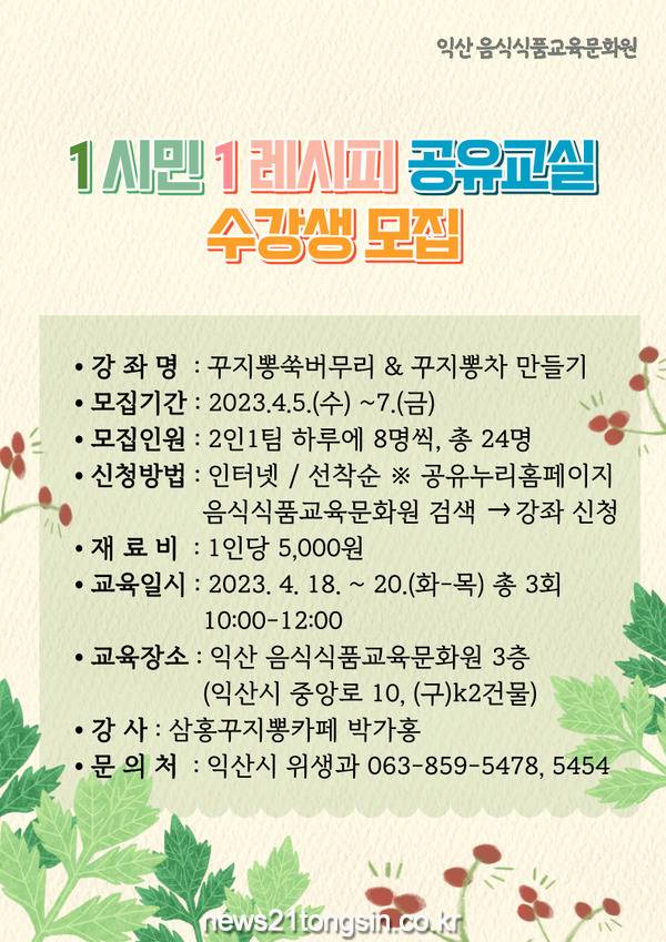 시는 익산역 앞 음식식품교육문화원에서 오는 18일부터 사흘 동안‘1시민 1레시피 공유교실’을 운영한다고 밝혔다.