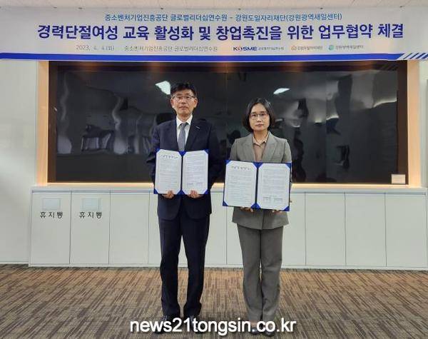 강원도와 강원도일자리재단(대표이사 박광용)이 운영하는 강원광역여성새로일하기센터(이하 강원광역새일센터)와 중소벤처기업진흥공단 글로벌리더십연수원(원장 정대훈, 이하 중진공 연수원)은 4일 중진공 연수원에서 경력단절여성 교육 활성화 및 창업촉진을 위한 업무협약을 체결했다.