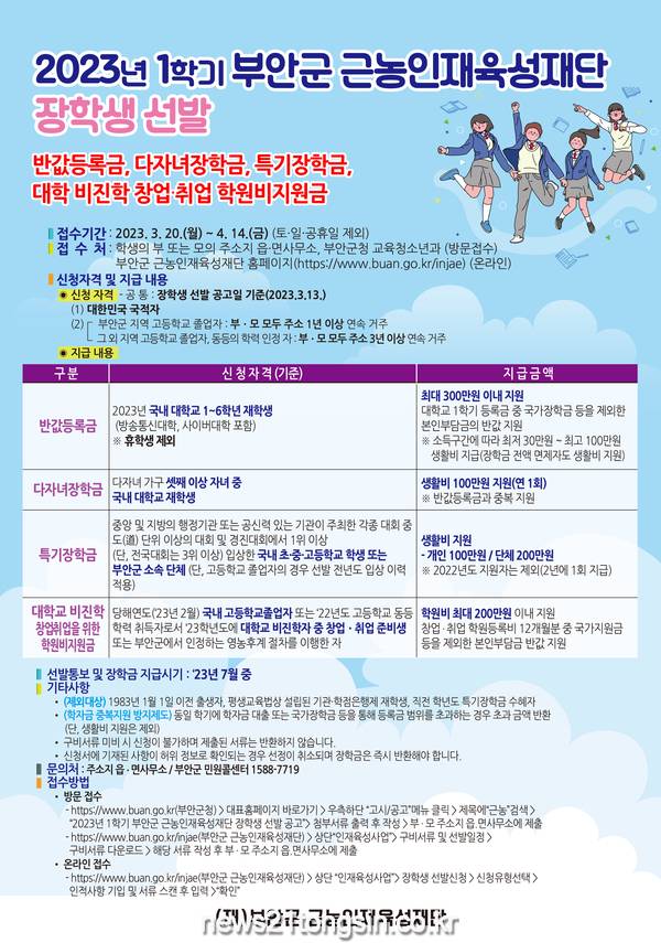 뉴스21통신전북/김문기기자=부안군 근농인재육성재단(이사장 권익현)은 지난 3월 20일부터 2023년 1학기 장학금 신청 접수를 받고 있다. 접수기간은 4월 14일까지이며, 반값등록금, 다자녀장학금, 특기장학금, 대학 비진학 창업‧취업을 위한 학원비지원금 4개 분야에 걸쳐 신청을 받는다.