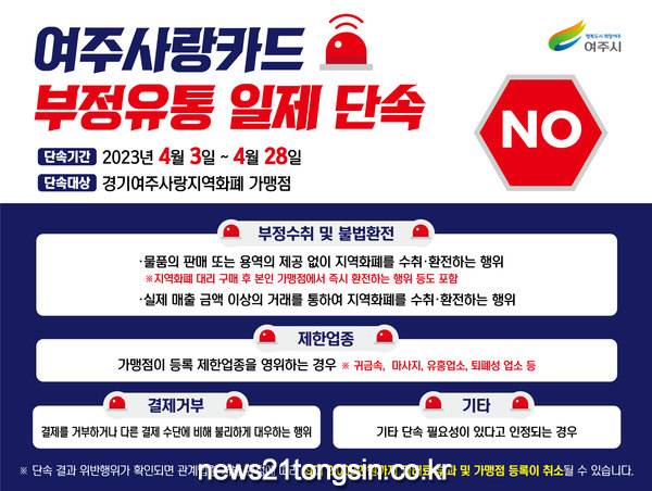 여주시(시장 이충우)는 지역화폐인 여주사랑카드의 부정유통 근절을 위해 오는 4월 3일부터 28일까지 합동단속에 나선다고 밝혔다.