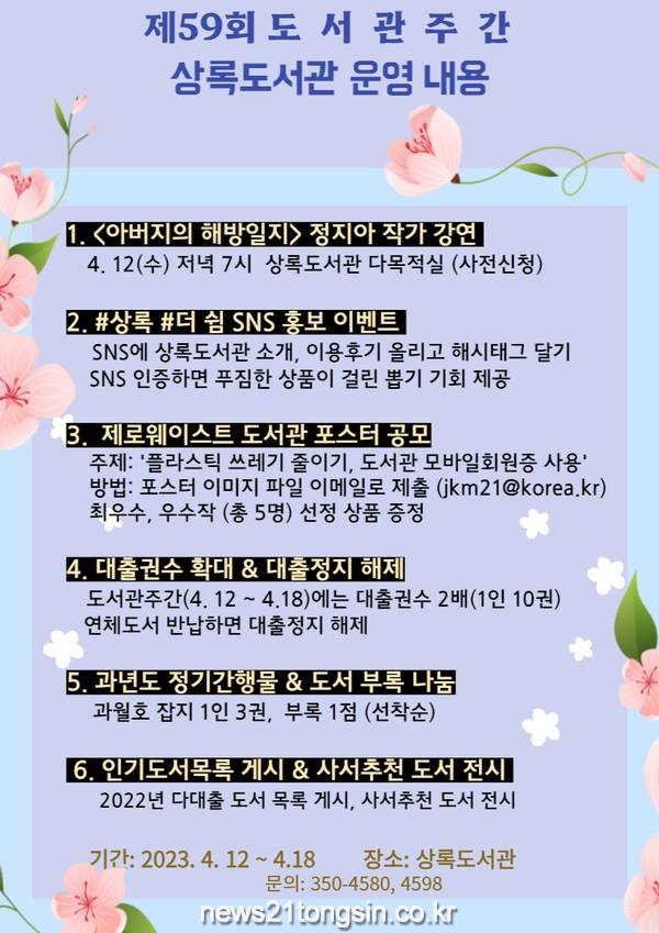 상록도서관에서는 「아버지의 해방일지」를 쓴 정지아 작가 초청강연, 특별한 도서문화상품을 내건 ‘#상록 #더쉼 SNS 홍보이벤트’, 제로웨이스트 도서관 캠페인 공모 등을 진행한다.