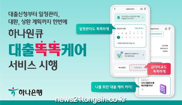 하나은행(은행장 이승열)이 모바일뱅킹 앱 ‘하나원큐’에서 대출신청에서부터 관리, 상환, 신용관리서비스, DSR계산기 등 대출에 관련된 모든 프로세스를 손님이 쉽고 간편하게 관리할 수 있는 ‘대출똑똑케어’ 서비스를 시행한다고 밝혔다.