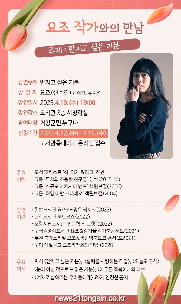 ‘실패를 사랑하는 직업’의 저자 요조 작가와의 만남 행사는 오는 19일 오후 7시 한마음도서관 3층 시청각실에서 진행되며, 글을 쓰고 노래하고 영화를 만들며 제주에서 ‘책방무사’를 운영하는 책을 각별히 사랑하는 요조(Yozoh, 신수진)가 신간 ‘만지고 싶은 기분’을 주제로 이야기를 전한다.