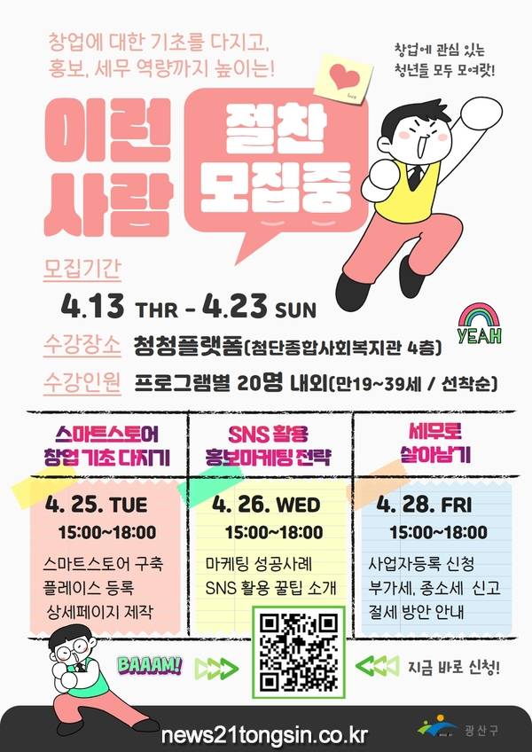 한편, 광산구 청년 취‧창업 지원 프로그램 ‘청고래’는 3월부터 11월까지 진행된다. 관내 청년들을 대상으로 취업‧창업‧자기 계발 3대 중점 분야별로 총 9개 프로그램을 운영 중이다.