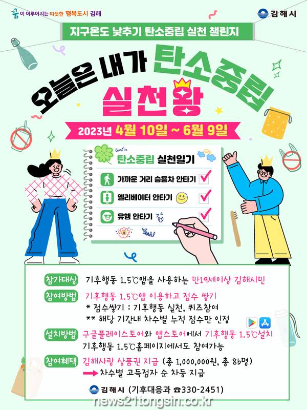 ‘오늘은 내가 탄소중립 실천왕’ 챌린지는 기후행동 1.5℃ 앱을 이용해 오는 6월 9일까지 진행되며 김해시에 거주하는 만19세 이상 시민이면 누구나 참여할 수 있다.