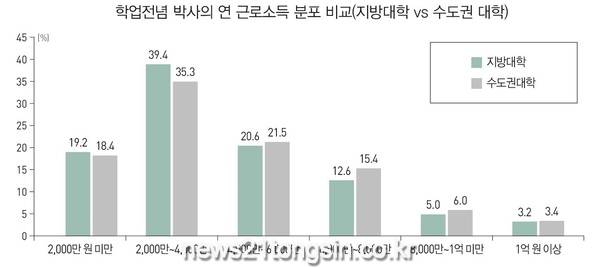 연 근로소득 4000만원 미만은 지방대학 박사 비중이, 4000만원 이상 구간은 수도권 대학 박사 비중이 각각 높았다.