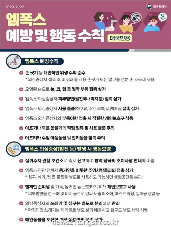 엠폭스 발생국가로 여행을 다녀 온 후 3주 이내 의심증상이 발생하거나 의심환자와 밀접접촉으로 증상이 있을 시 질병청 콜센터(1339) 또는 보건소로 상담을 받고, 모르는 사람들과 밀접한 접촉(피부·성접촉)을 하지 않도록 각별히 주의해야 한다.