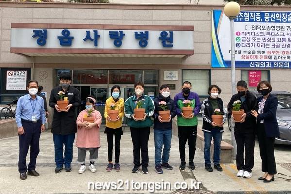 이날 주간보호센터 원예 교실에 참여 중인 장애인들은 손수 만든 수국 화분 50개를 정읍사랑병원, 정읍아산병원, 한국병원 등 정읍지역 의료기관 종사자들에게 직접 전달했다.