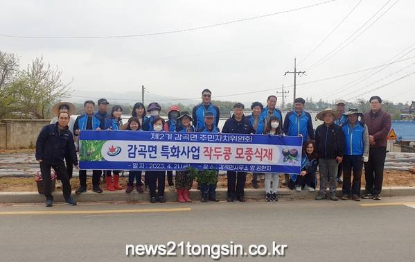 뉴스21통신전북/김문기기자=지난 21일 감곡면에서는 주민자치위원회(위원장 진명신)와 면사무소 직원들이 감곡면사무소 앞 공한지 332㎡에 지역특화작물인 작두콩 모종 500주를 식재하였다.