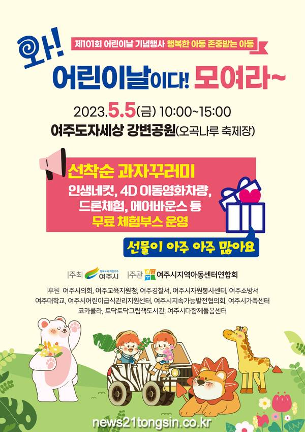 여주시(시장 이충우)가 주최하고, 여주시지역아동센터연합회(회장 조성훈)가 주관하는 제101회 어린이날 기념행사가 5월 5일(금) 여주 신륵사국민관광지 강변공원(여주도자세상)에서 열린다.