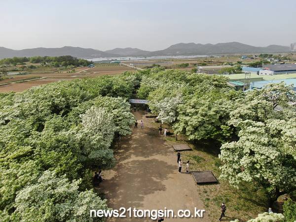 올해는 평년보다 조금 이른 4월 말에 이팝나무의 꽃이 만개 되어 군락지 전체가 하얀 눈꽃으로 장관을 연출하고 있다. 하늘에서 보면 마치 흰 구름이 땅 위에 내려앉은 것 같이 보이며, 숲길을 걸으면 마치 구름 속을 걷는 듯한 기분을 만끽할 수 있다.