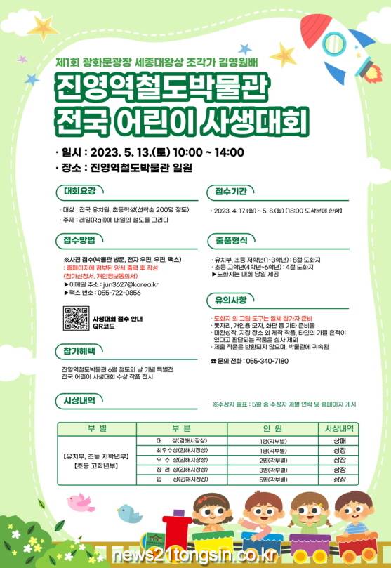 사생대회 주제는 ‘레일(Rail)에 내일을 그리다’로 유치원생·초등학생을 대상으로 진행된다. 사전접수는 4월 17일(월)부터 5월 8일(월)까지로 박물관 방문, 우편, 팩스(055-722-0856), 전자우편(jun3627@korea.kr)으로 접수 가능하다. 자세한 대회 요강은 박물관 홈페이지(https://jinyeongmuseum.modoo.at)를 참조하면 된다.