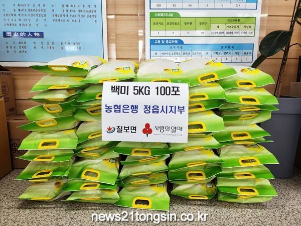 뉴스21통신전북/김문기기자=NH농협은행 정읍시지부(지부장 이재연)은 25일 131만원 상당의 백미 100포(5kg)를 칠보면사무소에 기탁했다.