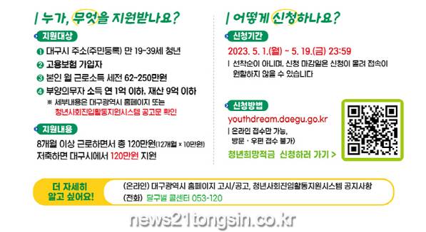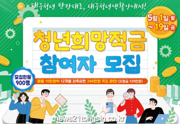 (뉴스21통신) 유재원기자 = 대구시는 사회진입 초기의 근로청년들에게 자산형성의 토대를 마련해 주기 위해 ‘2023년 청년희망적금’ 사업을 실시한다.
