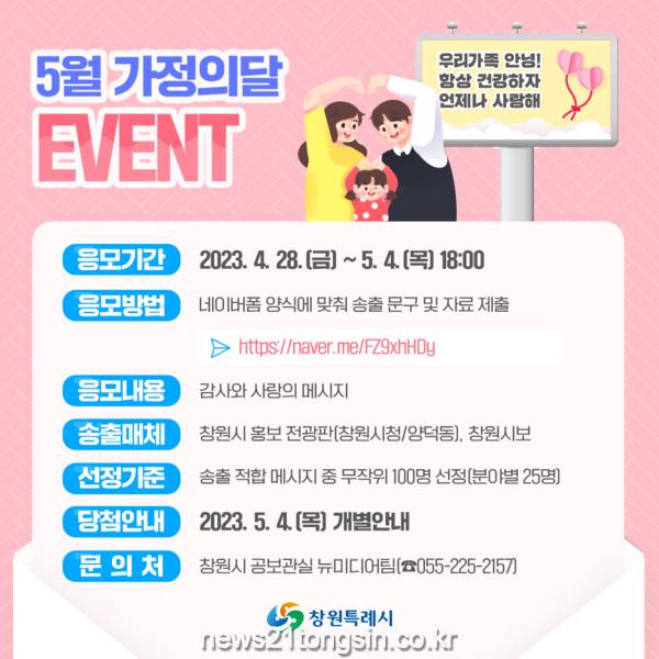 창원특례시(시장 홍남표)는 28일부터 내달 4일까지 온라인 신청을 받아 시민 100명을 선정해 감사와 사랑의 메시지를 창원시 홍보 전광판(창원시청/양덕동)과 창원시보에 게재하는 이벤트를 진행한다.