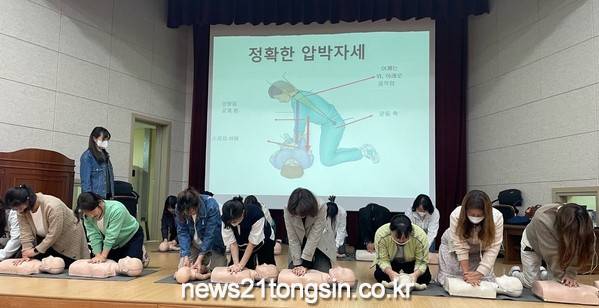 이틀에 걸쳐 보육교직원 90여명을 대상으로 행안부 어린이안전교육 전문기관 지정시설 대표인 유현정 강사를 초빙해 성희롱·성폭력 예방교육과 의무교육을 진행하고, 어린이집에서 영유아에게 응급 상황 발생 시 최초 목격자로서 신속하게 초기 대응할 수 있도록 응급대처 요령과 심폐소생술 실습이 포함된 안전교육을 실시했다.
