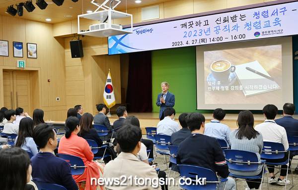 광주광역시 서구가 공직자들을 대상으로 진행한 청렴교육을 성황리에 끝마쳤다.서구는 청렴문화를 확산시키고, 시민에게 신뢰받는 공직사회 조성을 도모키 위해 지난 27일 구청장을 비롯해 간부공무원 및 신규 공직자들 100여 명을 대상으로 ‘함께 만드는 청렴韓 세상’이라는 테마로 청렴교육을 실시했다.