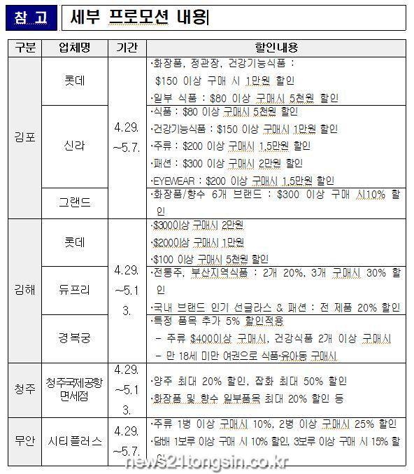 김포(롯데·신라·그랜드), 김해(롯데·듀프리·경복궁), 청주(청주국제공항면세점), 무안(시티플러스)공항의 입·출국장 면세점에서 구매 금액과 수량에 따라 최대 50%까지 할인을 받을 수 있으며, 화장품·패션·건강기능식품·주류 등 다양한 품목에서 혜택이 제공된다.