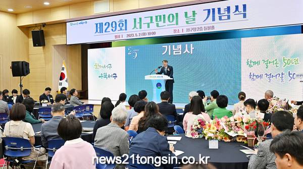 서구민의날 기념식은 주민대표와 공직자 등 200여 명이 참석한 가운데 ‘함께 걸어온 50년, 함께 걸어갈 50년’을 주제로 개청 후 반세기의 역사를 되돌아보며 그간의 성과와 서구 발전방향을 공유하는 자리로 진행됐다.