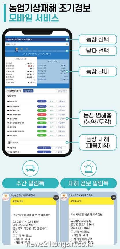 의성군은 농업 분야에 디지털 전환을 추진하며, 농작물 생산 안정성 확보를 위해 전국 시·군 최초 ‘농업기상재해 조기경보서비스’를 시작한다.
